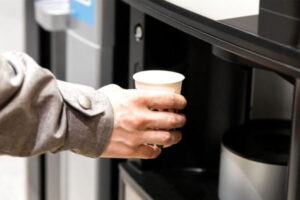 Een man, werkzaam als chauffeur en planner bij een transportbedrijf gebruikt een sleutel waarmee hij het koffieapparaat op het werk kan openen: op deze manier…